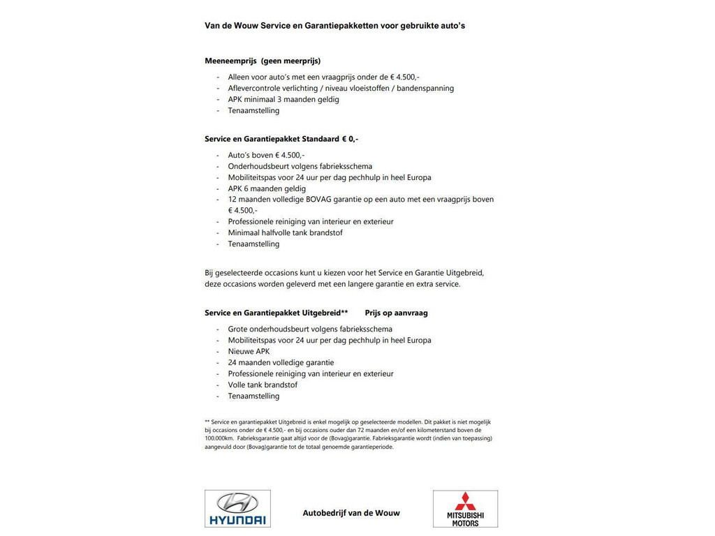 ** Service en garantiepakket Uitgebreid is enkel mogelijk op Hyundai en Mitsubishi modellen. Dit pakket is niet mogelijk bij occasions onder de € 4.500,- en bij occasions ouder dan 72 maanden en/of een kilometerstand boven de 100.000km. Fabrieksgarantie gaat altijd voor de Bovag garantie. Fabrieksgarantie wordt (indien van toepassing) aangevuld door Bovag garantie tot de totaal genoemde garantieperiode.