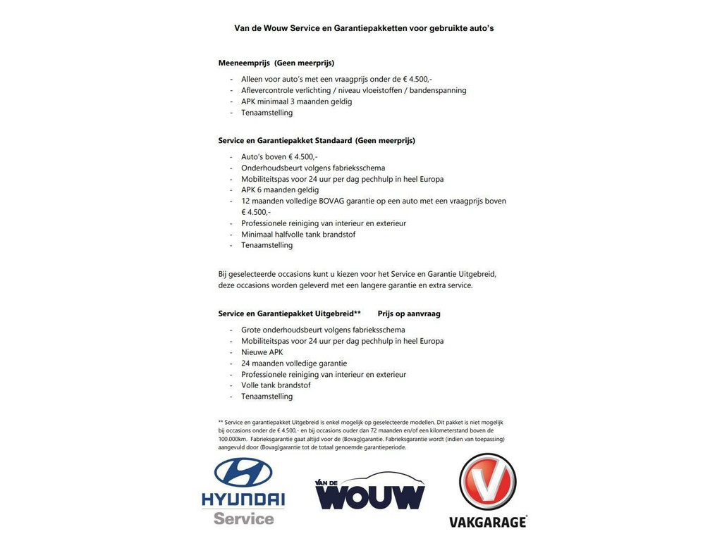 ** Service en garantiepakket Uitgebreid is enkel mogelijk op Hyundai en Mitsubishi modellen. Dit pakket is niet mogelijk bij occasions onder de € 4.500,- en bij occasions ouder dan 72 maanden en/of een kilometerstand boven de 100.000km. Fabrieksgarantie gaat altijd voor de Bovag garantie. Fabrieksgarantie wordt (indien van toepassing) aangevuld door Bovag garantie tot de totaal genoemde garantieperiode.